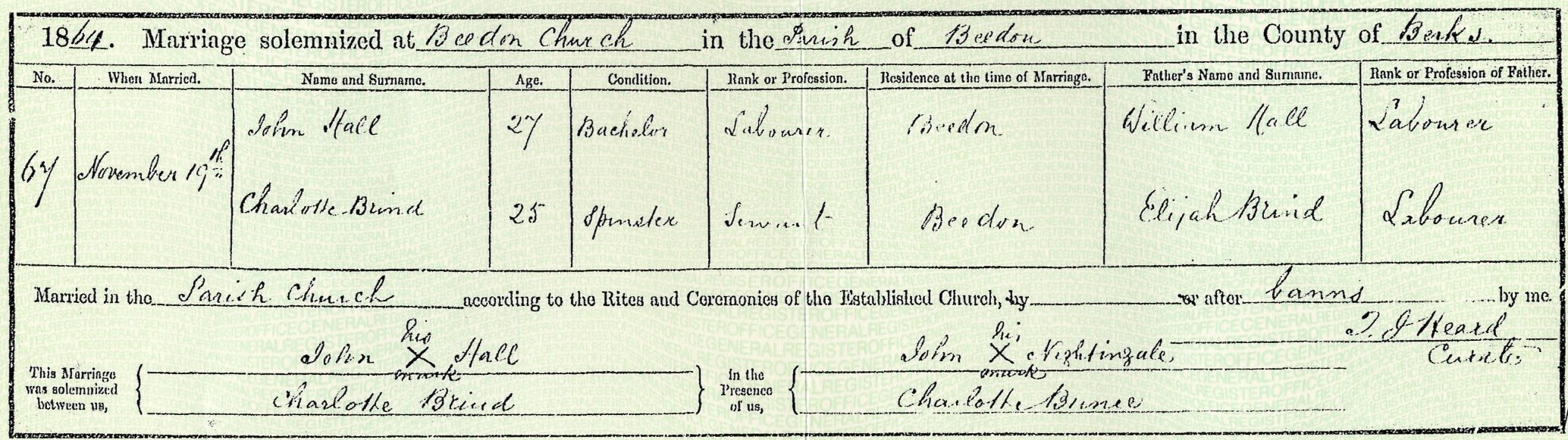 | Charlotte Brind | 25 | Spinster | Servant | Beedon | Elijah Brind | Labourer |