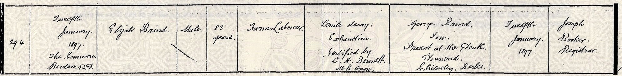 Elijah Brind | Male | 83 | Farm Labourer | Senile decay Exhaustion? Certified by E H Bennett MB Gxm |
