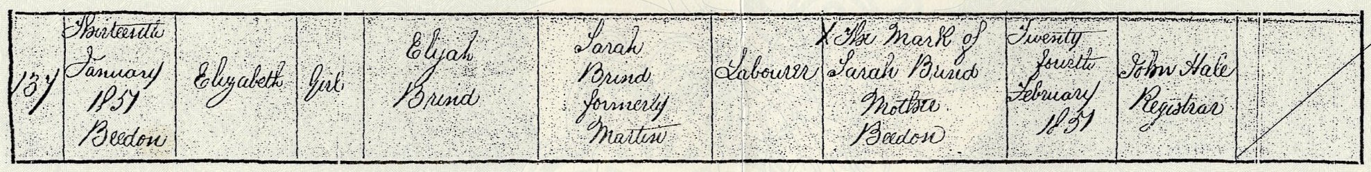 | 137 | 13th January 1851 | Elizabeth | Girl | Eijah Brind | Sarah Brind formerly Martin | Labourer | Sarah Brind Mother Beedon | 24th February 1851 | John Hale Registrar | / / / / / |