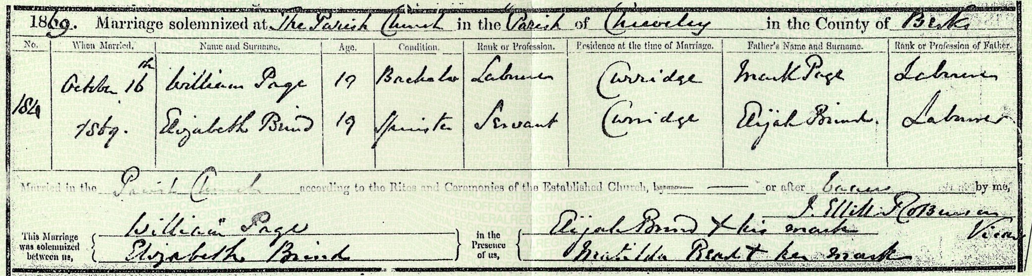 | 184 | Oct 16, 1869 | William Page | 19 | Bachelor | Labourer | Carridge? | Mark Page | Labourer |