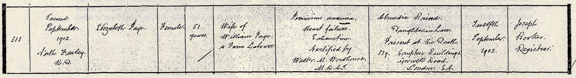 Elizabeth Page | Female | 51 years | Wife of William Page a farm labourer | Cause of death | Almedia Brind daughter in law 339 Compton? Buildings, Genvell Road, London E4????? |