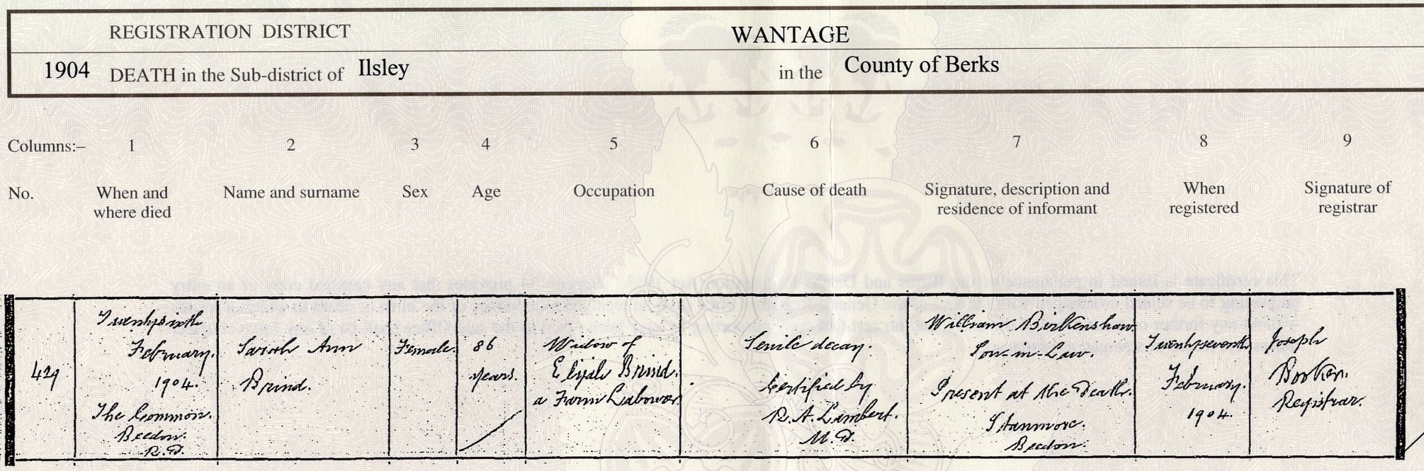 Sarah Ann Brind | Female | 86 years | Widow of Elijah Brind a farm labourer | Senile decay certified by R A Lambert MD | William Birkenshaw son in law Present at the death Stanmore Beedon |