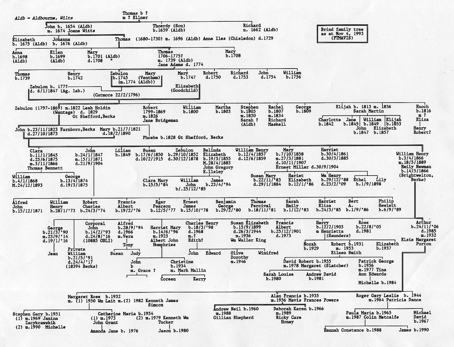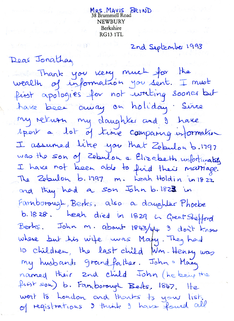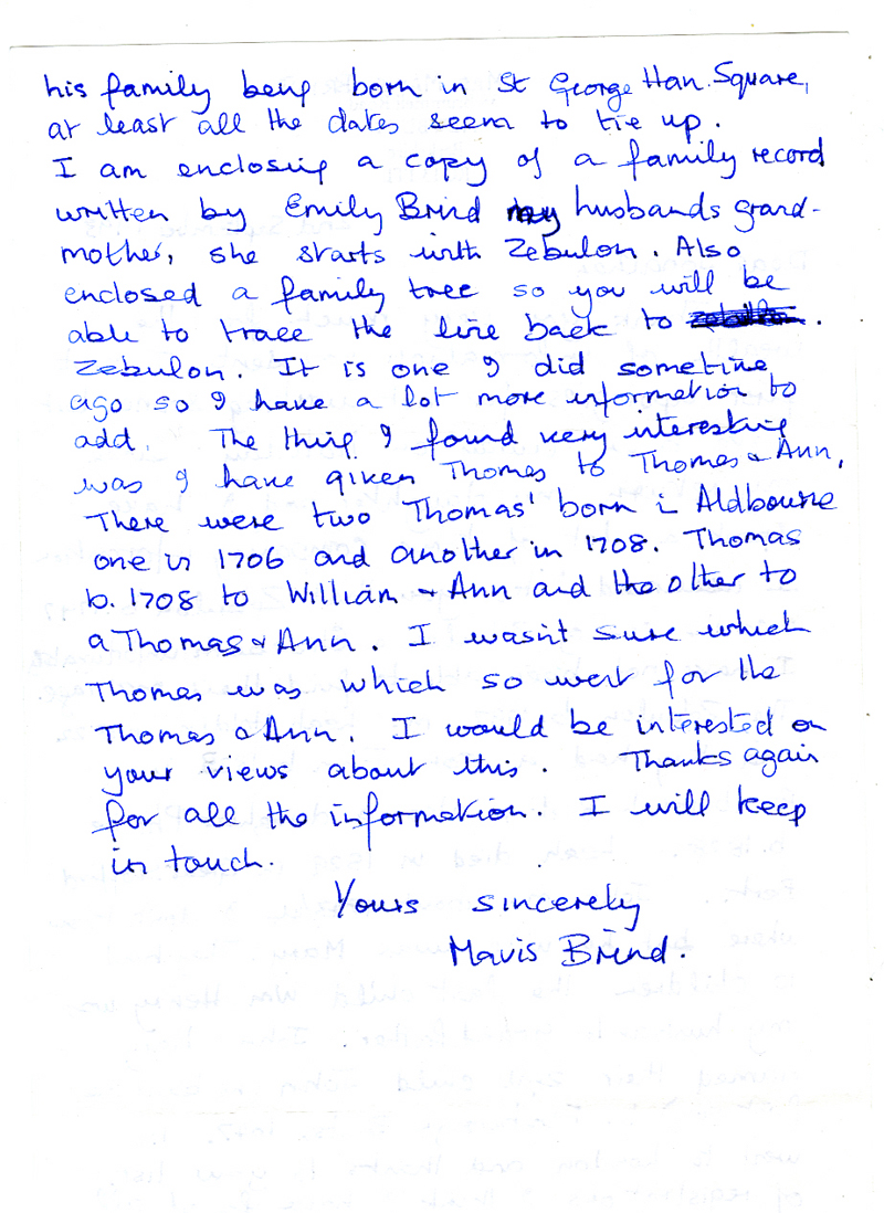 3 St Helier's Road 4 November 1993. Dear Mavis, Thank you very much for your letter and 'Copy of Family recorded by Emily Brind wife of Wm. Henry Brind b. 1866'. I guess this probably comes from a family bible? I have produced a copy of your family tree, and have added some information so I am enclosing a copy with this letter. I wrote to Chris Willmore, who did the work on the pre-Zebulon Brinds to raise the issue of whether it was the 1706 Thomas or the 1708 Thomas. So far I have yet to hear anything from her on the subject, but we are supposed to meet some time so maybe I will raise the subject again. I am not sure we will ever get an absolute answer to this question, in any case. Looking at your family tree I see that two of William & Emily's sons died serving in the First World War and a second died during the war. That must have been tough. Have you ever tried to get the service records of William and John? I have put their serial numbers on my latest version to help you do this, if you wish to. I have drawn a complete blank on Belinda Elizabeth born March 19, 1855. I can not seem to find an entry for her birth. Was she registered, or have I made a mistake somewhere? Finally, you say you have a lot more information. If you like to photocopy this sheet and add the additional data (if there is room) I will include it in a new version. Yours sincerely, Jonathan Brind |