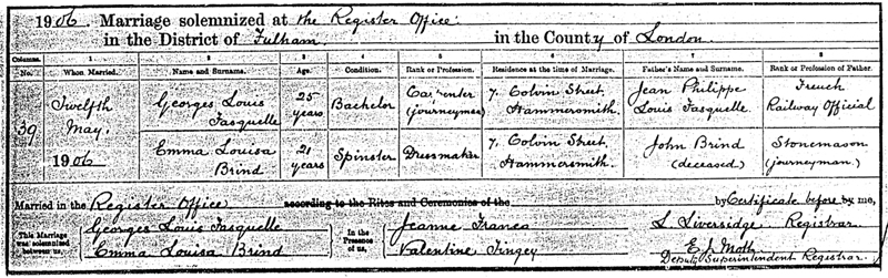 | 39 | Twelfth May, 1906 | Georges Louis Fasquelle | 25 | Bachelor | Carpenter (journeyman) | 7 Colvin Street, Hammersmith | Jean Philippe Louis Fasquelle | French Railway Official |