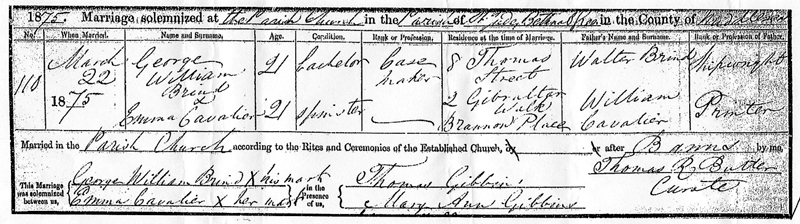 | 110 | March 22nd 1875 | George William Brind | 21 | Bachelor | Case maker | 8 Thomas Street | Walter Brind | Shipwright |