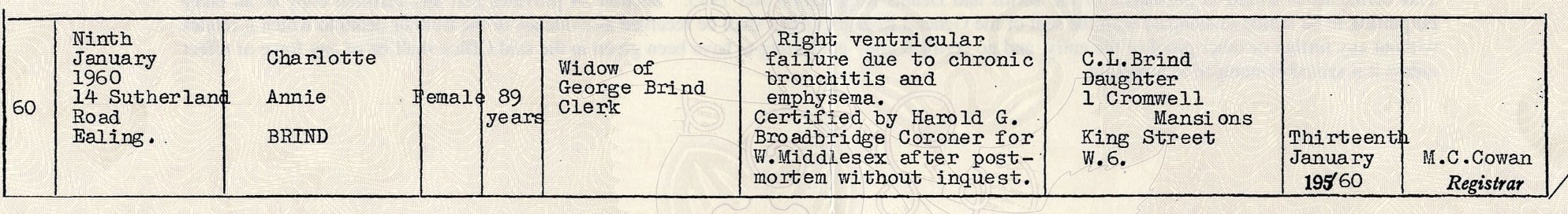 Right ventricular failure due to chronic bronchitis and emphysema. Certified by Harold G Broadbridge Coroner for W Middlesex after post mortem without inquest | C L Brind daughter 1 Cromwell Mansions, King St, W6 |