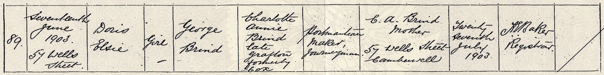 Doris Elsie | Girl | George Brind | Charlotte Annie Brind late Grafton formerly Cox | Portmanteau maker journeyman | C A Brind mother 57 Wells Street, Camberwell |