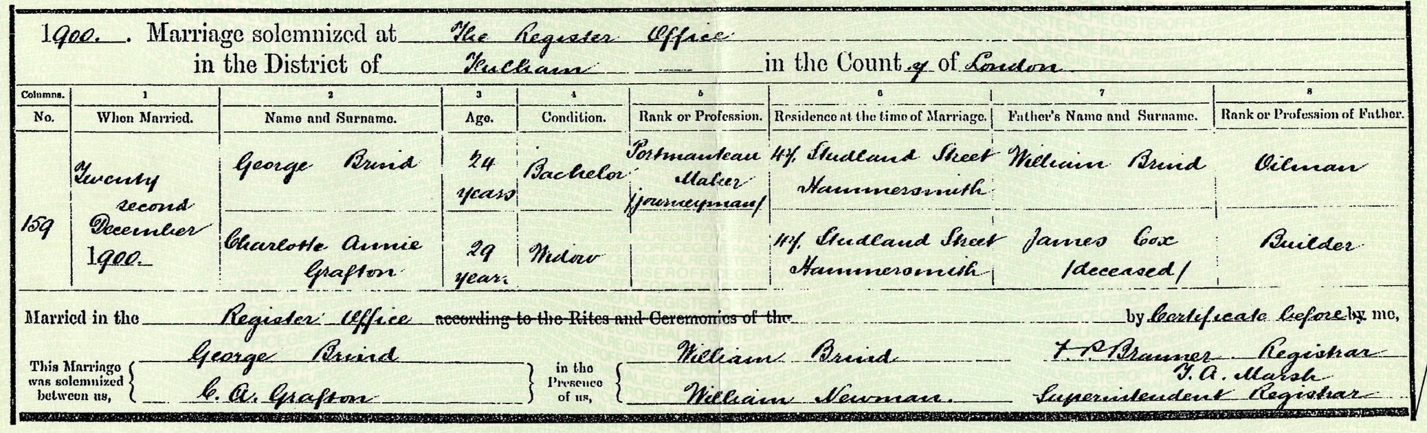 | 159 | 22nd Dec 1900 | George Brind | 24 years | Bachelor | Portmanteau maker (journeyman) | 47 Studland Street, Hammersmith | William Brind | Oilman |