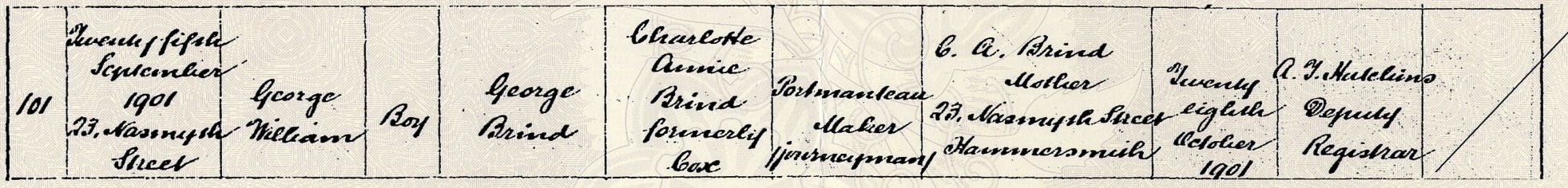 George William | Boy | George Brind | Charlotte Annie Brind formerly Cox | Portmanteau maker (journeyman) | C A Brind mother 23 Naismyth St Hammersmith | 28th October 1901 | A J Halebins? Registrar | / / / / / |