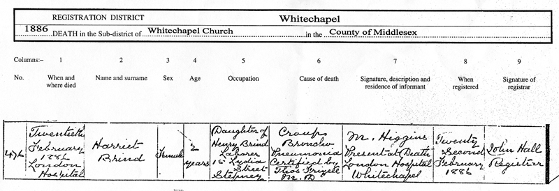 Female | 2 years | Daughter of Henry Brind Labourer 15 Lydia Street, Stepney | Croup Bronchial Pneumonia Certified by Thos Frizele M.D. |