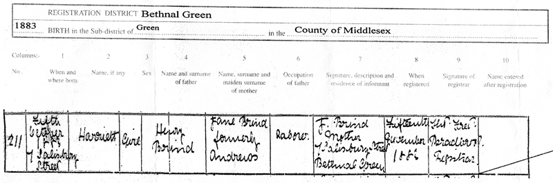 Labourer | J Brind Mother 7 Salisbury Street Bethnal Green |