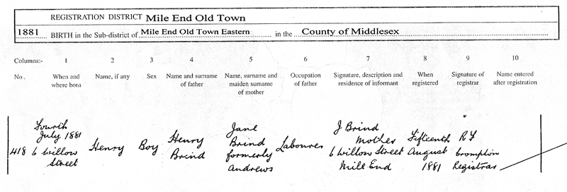 Labourer | J Brind Mother 6 Willow Street Mile End |