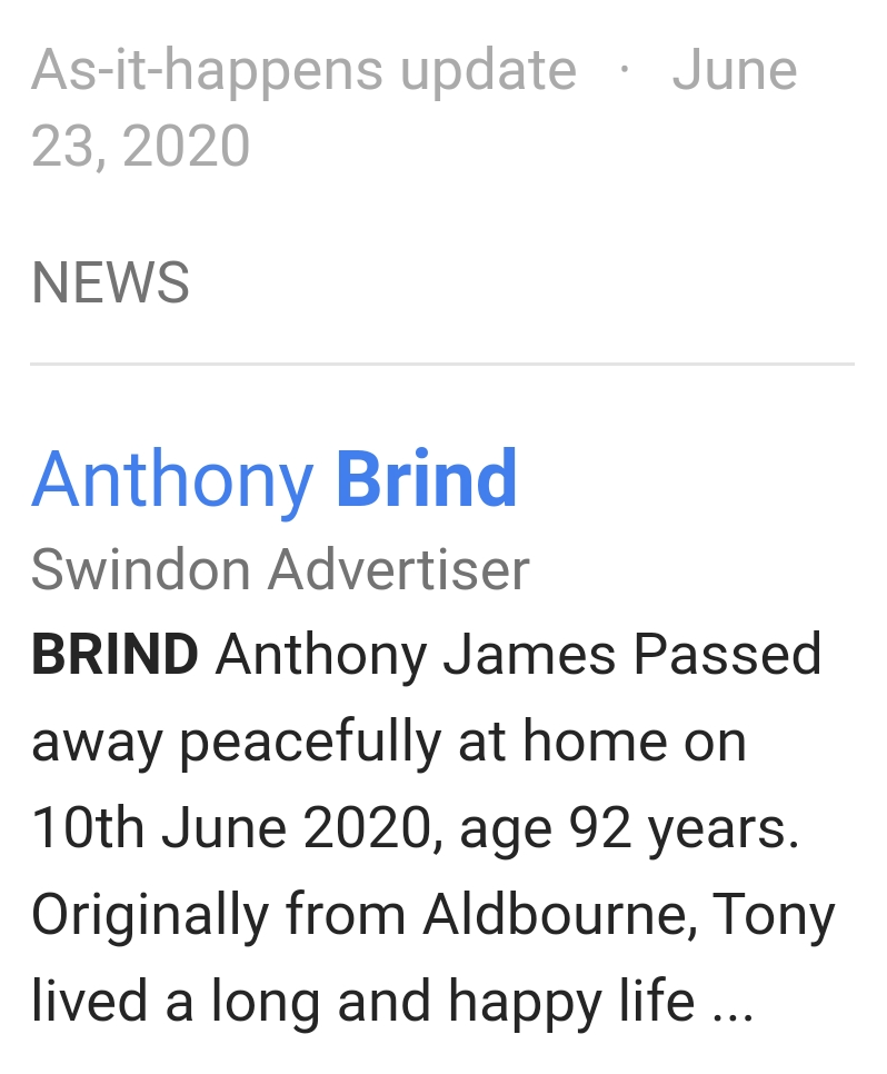 From: Kenneth and Mary Brind Date: 16 May 2007 15:14:59 BDT To: Jonathan Brind Subject: Re: I have just been sent some documents about the brief military career of your father I have phoned my brother Tony in Swindon this morning. He has records of our father's military service ,which included service in France, and a photo or two. He is going to dig them out. Yes, he did indeed have a cleft palate but had no difficulty carrying on a normal conversation. Ken ----- Original Message ----- From: Jonathan Brind To: Kenneth and Mary Brind Sent: Tuesday, May 15, 2007 11:43 AM Subject: I have just been sent some documents about the brief military career of your father I have just been sent some documents about the brief military career of William John Brind 1891-1968, the Aldbourne thatcher, and I think your father. William John attempted to enlist, or was drafted in 1914 but they wouldn't have him because he had an extensive cleft palate, which meant he articulated quite inaudibly making him useless as a soldier. It probably saved his life. He was 5'6", weighed 144lbs, a little over ten stone, and had a 36" chest (or 39" expanded), when he was 22 years old. Did he really have a cleft palate or was it just a case that they couldn't understand his accent? Jonathan Brind On 30 Apr 2007, at 19:34, Kenneth and Mary Brind wrote: Good morning Jonathan, Thanks again for the CDs, we have now had an opportunity to play them, The hifi copy is thoroughly enjoyable, especially the stories and the accent. Haven't heard an accent like that for many years. The computer version was not quite as successful as I cannot get any audio and I presume there is a commentary, but over the next few days I will get someone with much more knowledge than I to have a look at what I need to do to get it right. The pictures, even without commentary, are very interesting. Thanks again, Ken |