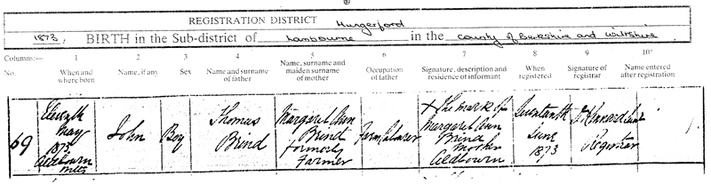 | Registration district of Hungerford 1873 BIRTH in the sub-district of Lambourne in the County of Berkshire and Wiltshire |