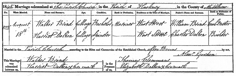 | See Dalton connection This is a quite remarkable certificate. It has been suggested by researcher Brian Snowdon that Elizabeth Dalton is the sister of the bride Harriet Dalton (though it is equally possible that Elizabeth Dalton was Walter Brind's mother, she had re-married after the death of William Brind). If Elizabeth is Harriet's sister, the bride was also the groom's niece since the Dalton girls were the daughters of Harriet Brind (sister of the groom Walter). Whilst this seems incredible, take a look at Harriet Dalton's father on the certificate, Charles Dalton (a builder). When Elizabeth Dalton married (John Joseph William Snowdon) she said her father was builder Charles Dalton. Walter and Harriet baptised their sons Charles John and Walter (on 29.7.1849 at St.Marys ,Haggerstone,Shoreditch) the same date and place as the eldest daughter of Elizabeth (Dalton) and her husband John Joseph William Snowdon. Apart from sharing the same father (Charles Dalton, builder) Elizabeth and Harriet Dalton also shared the same unusual profession, bookbinder. But the story becomes even more bizarre. Brian Snowdon believes that at the time Walter married his niece although he said his marital status was bachelor (not the more reasonable divorced or widower since he hd been married before) he was actually still married and had a daughter in Australia! See Brian Snowdon's email of June 1, 2012 |