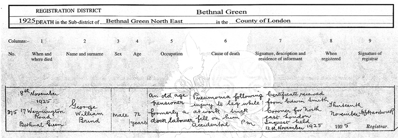 | Certified copy of an entry of DEATH | Registration district | Bethnal Green | 1925 DEATH in the Sub-district of Bethnal Green North East in the County of London |