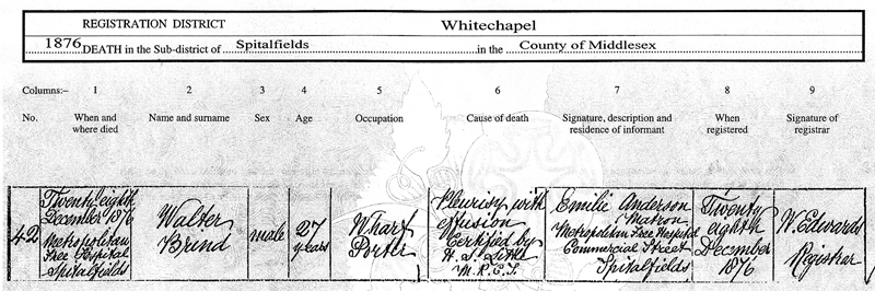 Male | 27 years | Wharf Porter | Pleurisy with effusion Certified by H S Sittle M.R.C.S. |