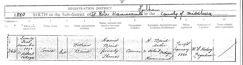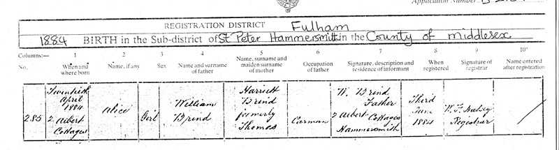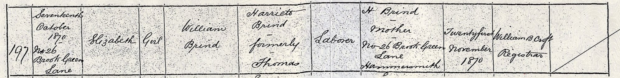 Elizabeth | Girl | William Brind | Harriet Brind formerly Thomas | Labourer | H Brind Mother 26 Brook Green Lane, Hammersmith |
