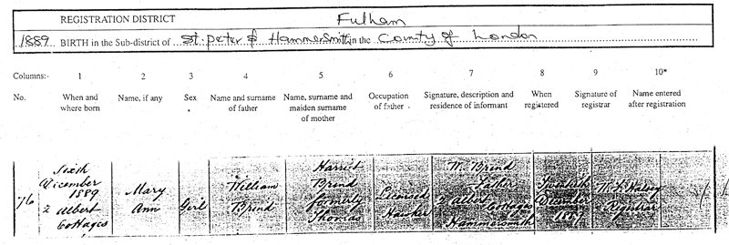 Mary Ann | Girl | William Brind | Harriet Brind formerly Thomas |