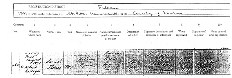 | Registration district Fulham 1891 BIRTH in the sub-district of St Peter Hammersmith in the County of London |