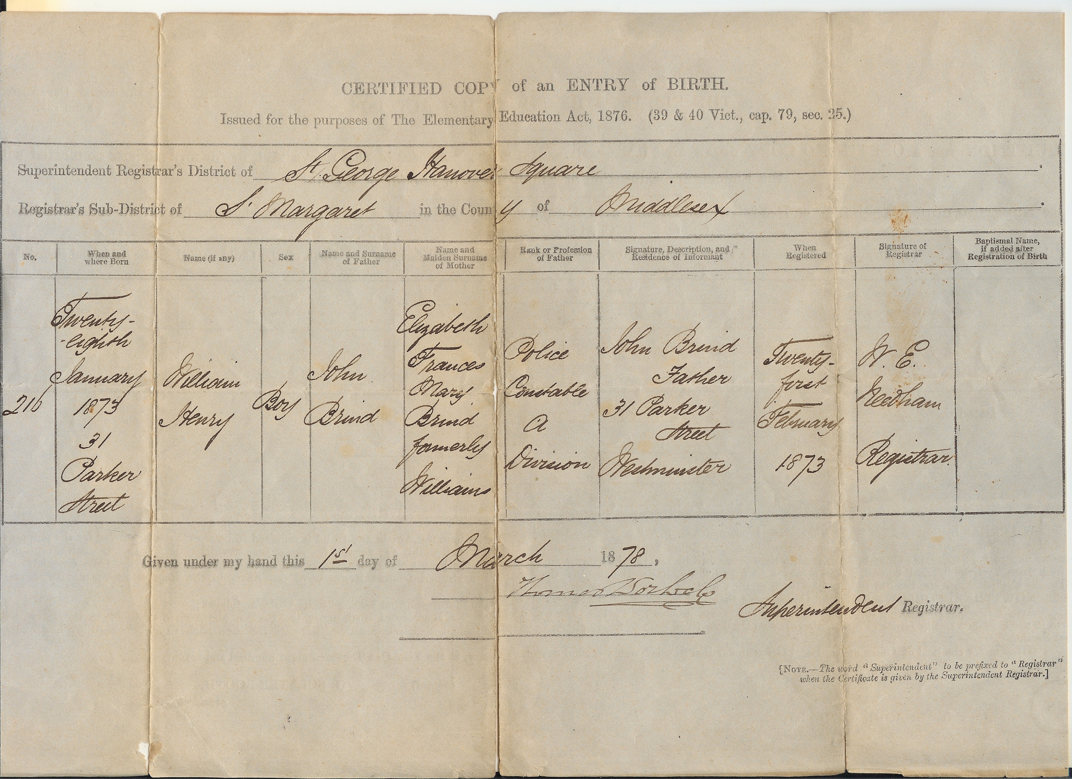 | b. 28/1/1873 Parker Street, Westminster See certificate |