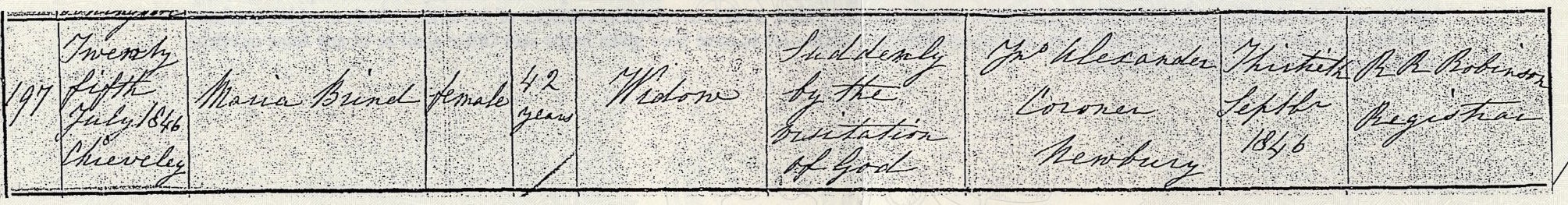 Maria Brind | Female | 42 years | Widow | Suddenly by the visitation of God | Tho. Alexander Coroner Newbury  |