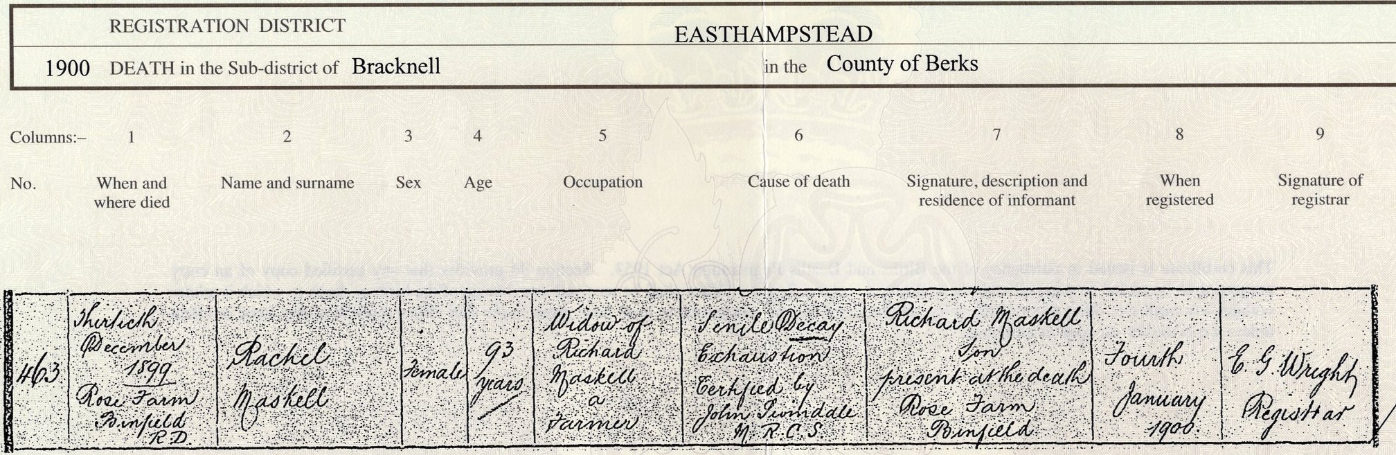 Rachel Maskell | Female | 93 years | Widow of Richard Maskell a farmer | Senile Decay Exhaustion Certified by John Twindale MRCS  |