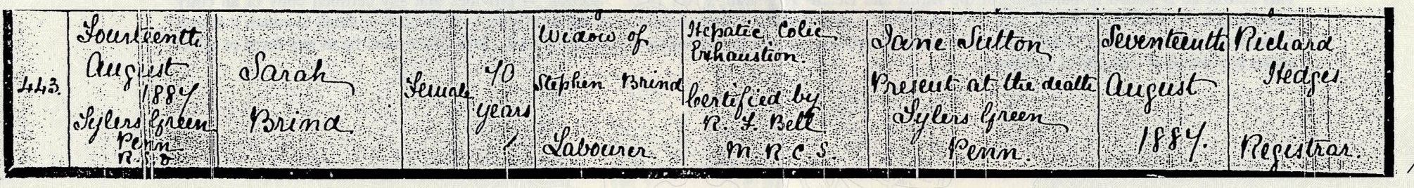Sarah Brind | Female | 70 years | Widow of Stephen Brind labourer | Hepatic Colic Exhaustion Certified by R F Bell MRCS  |