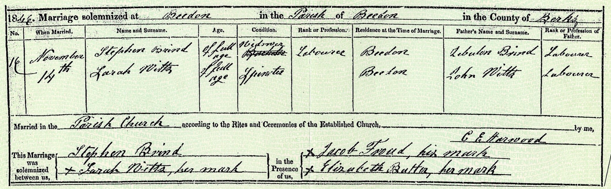 | 16 | Nov 14 | Stephen Brind | full age | Widower | Labourer | Beedon | Zebulon Brind | Labourer |