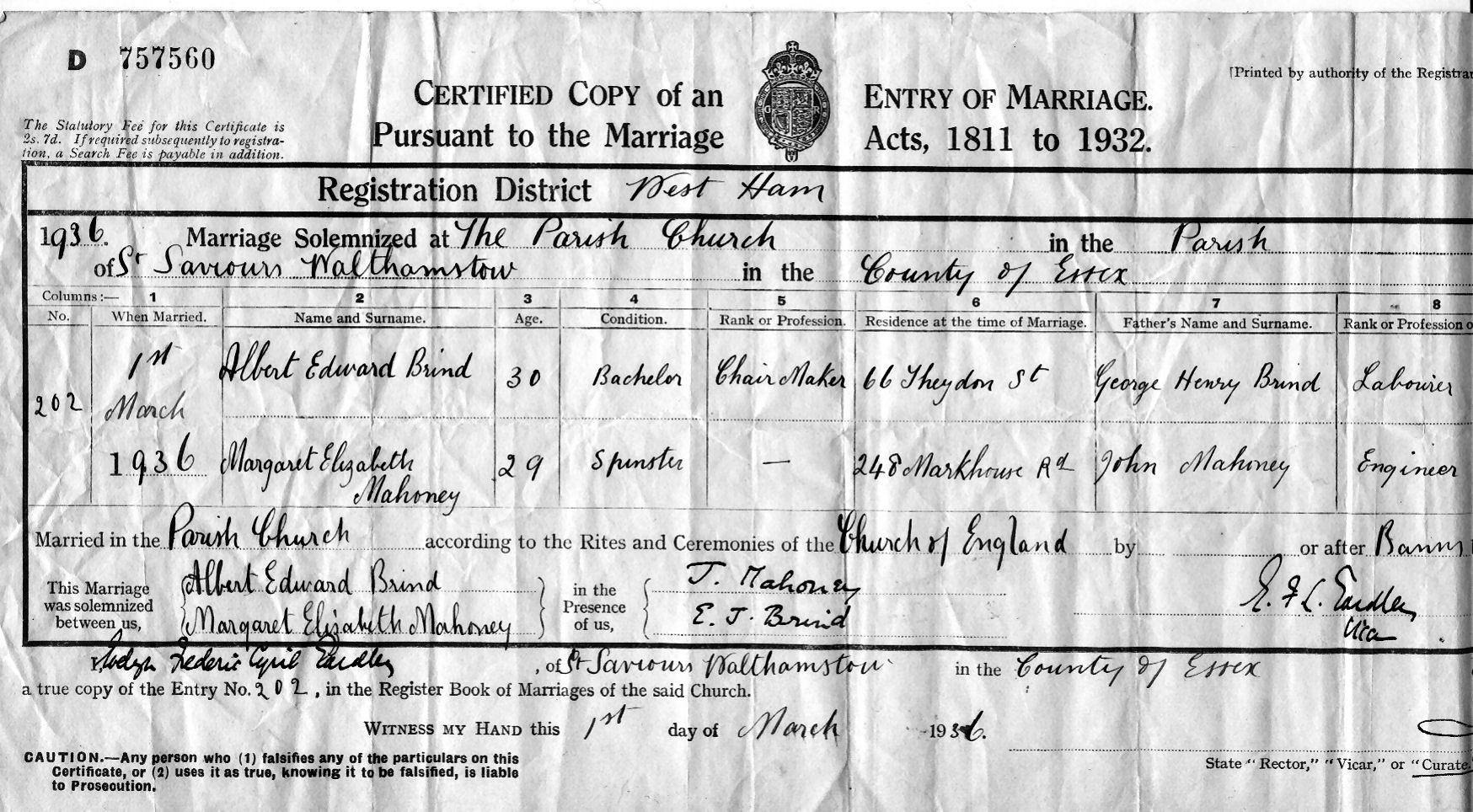 | 202 | 1st March 1936 | Albert Edward Brind | 30 | Bachelor | Chair maker | 66 Theydon Street | George Henry Brind | Labourer |