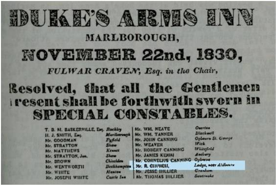 The news had spread quickly from village to village but although the contagious aspect alarmed the authorities they were somewhat slow in their response. Some troops were dispatched to some of the troubled districts but as far as the Marlborough area is concerned the government left it to our own local magistrates to deal with their own problems so special constables were sworn in and landowners organised their own forces made up of tenants and servants. On 4th of December 1830 and only a few weeks following the troubles, Stephen Neate of South Street and Richard Church were appointed the principal constables for the purpose of protecting property and suppressing riot for Aldbourne.