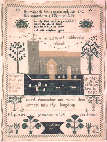In 1839 Eliza Gibbons stitched her silken sampler of Chieveley Church. The sampler eventually ended up with another branch of the family after Eliza's death, and was offered to our local auctioneers Dreweatt Neat early in 1996. Discover how the sampler returned home after it was purchased by Mr Victor Pocock. The sampler was sent to the Textile Conservation Centre at Hampton Court Palace to be cleaned and conserved; the work on its restoration was done by Tarja Bennett. The sampler made by Eliza Gibbons contains many references to the Bible and other religious books, which are listed together with references to their sources on this page. See http://NeedleworkSamplers.com/Chieveley/ |