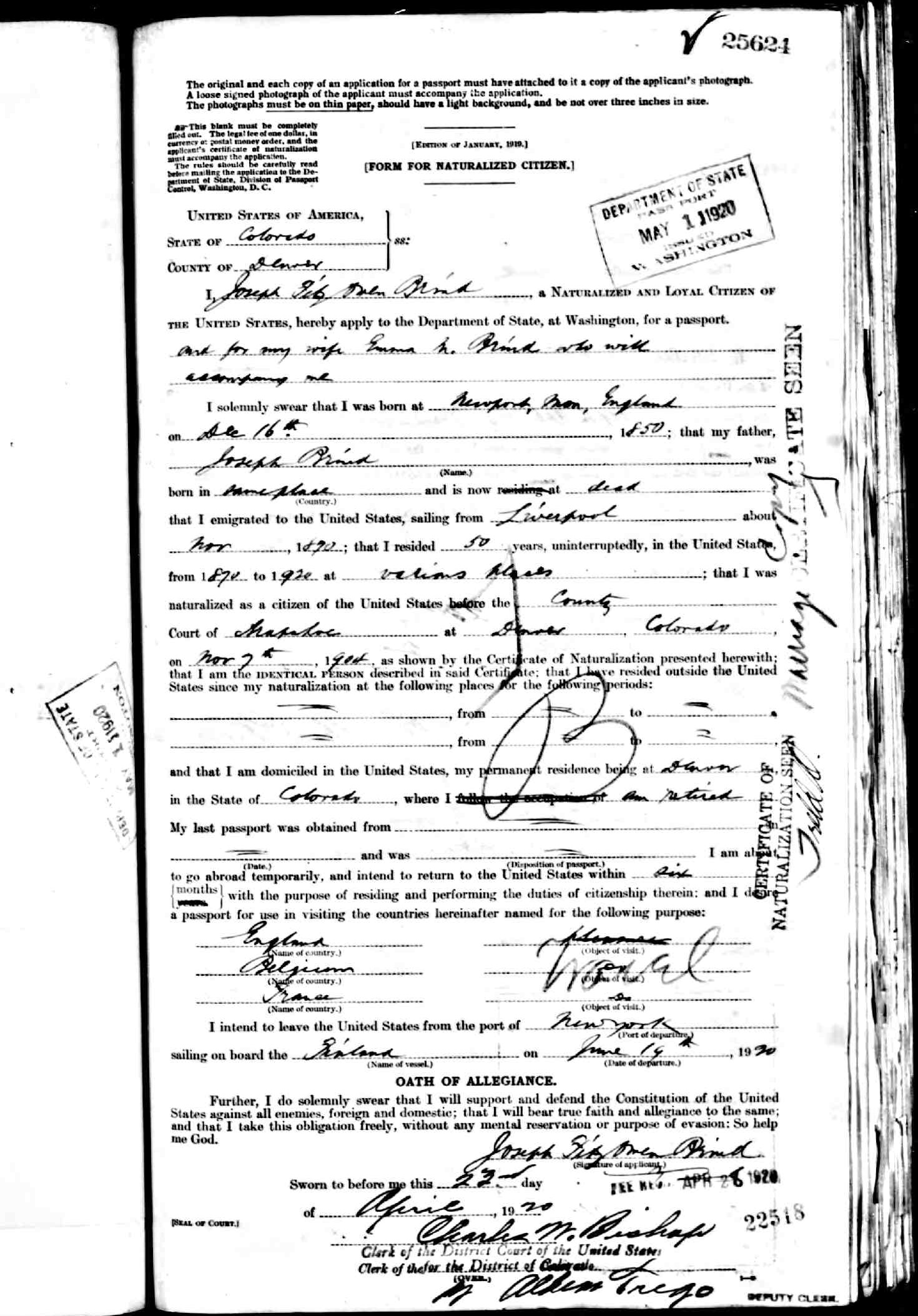 | apply for passport:and for my wife Emma M Brind who will accompany me |