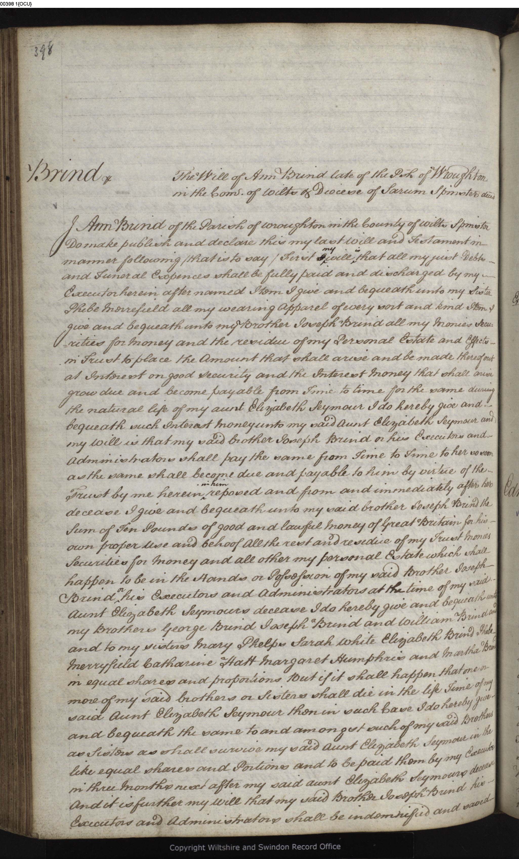 I Ann Brind of the Parish of Wroughton in the County of Wilts Spinster Do make publish and declare this my last will and testament in manner following that is to say / First my will is that allmy just Debts and funeral expenses shall be fully paid and discharged by my executor herein after name Item I give and bequeath unto my sister Phebe Merrefield all my wearing apparel of every sort and kind Item I give and bequeath unto my brother Joseph Brind all my monies secu- rities for money and the residue of my personal estate and effects in trust to place the amount that shall arise and be made thereafter at interest on good security and the interesst money that shall arise grow due and become payable from time to time for the same during the natural life of my aunt Elizabeth Seymour I do hereby give and my will is that my said brother Joseph Brind or his Executors and administrators shall pay he same from time to time to her to so soon as the same shall become due and payable to him by virtue of the Trust by my herein in him reposed and from and immediately after her decease I give and bequeath unto my said brother Joseph Brind the sum of ten pounds of good and alawful money of Great Britain for his own proper use and behoof all the rest and residue of my trust moneys Securitiies for money and all other my personal estate which shall happen be in the hands of possession of my said brother Joseph Brind or his Executrs and aministrators at the time of my said aunt Elizabeth Seymour's decease I do hereby give and beqeth unto my brothers George Brind Joseph Brind and William Brind and and to my sisters Mary Phelps Sarah White Elizabeth Brind Phebe Merryfield Catherine Hatt Margaret Humphries and Martha Brind in equal shares and properotions but if it shall happen that one or more of my said brothers or sisters shall die in the life time of my said aunt Elizabeth Seymour then in such case I do hereby give and bequeath the same to and amongst such of my said brothers and sister as shall survive my said aunt Elizabeth Seymour in the like equal shares and portions and to be paid them by my Executor in three months next after my said aunt Elizabeth Seymour's decease and it is further my will that my said brother Joseph Brind his Executors and administrators shall be indemnified and saved |