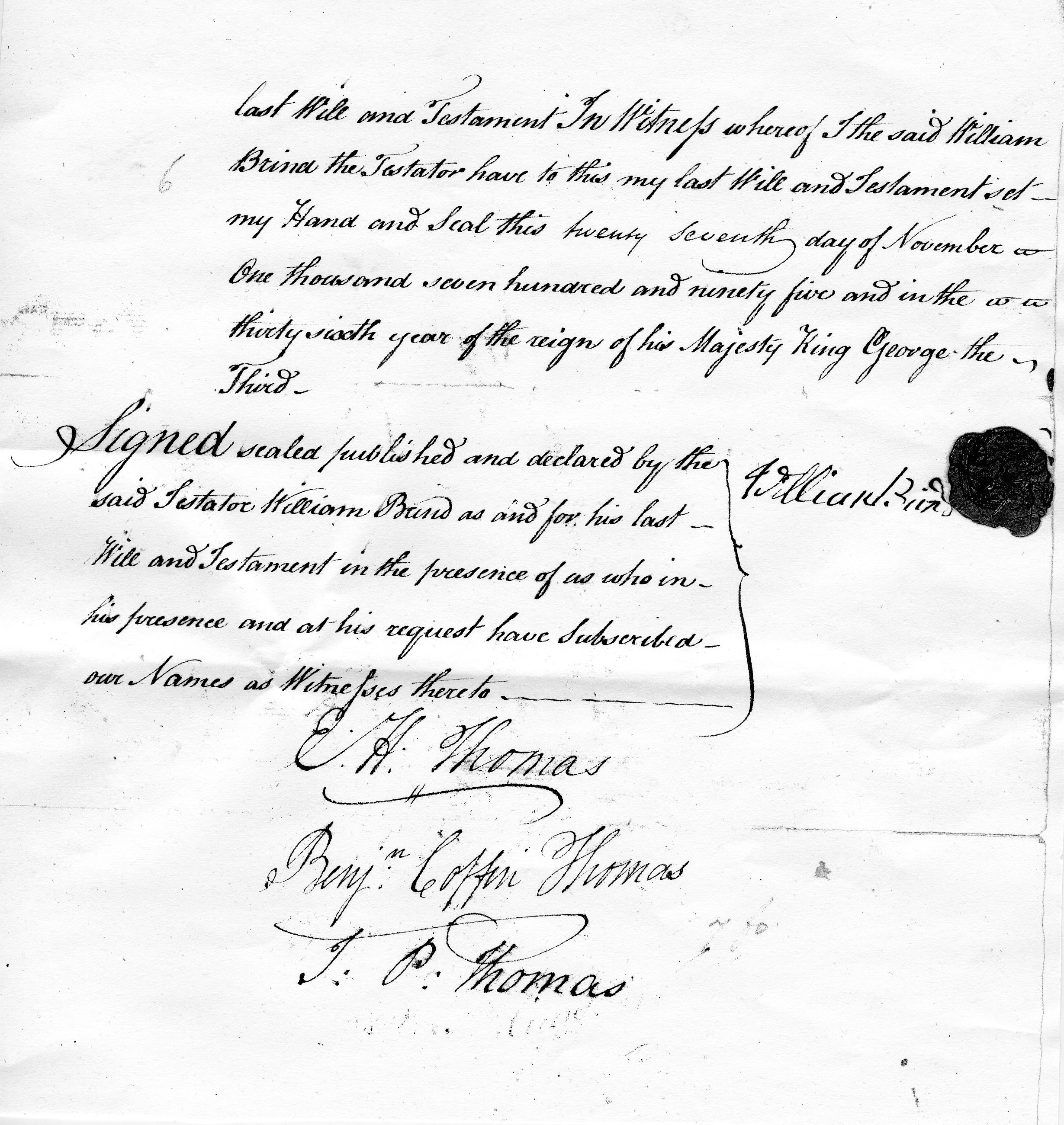 Brind the Testator have to this my last will and testament set my Hand and Seal this twenty seventh day of November One thousand seven hundred and ninety five and in the thirty sixth year of the reign of his Majesty King George the Third William Brind