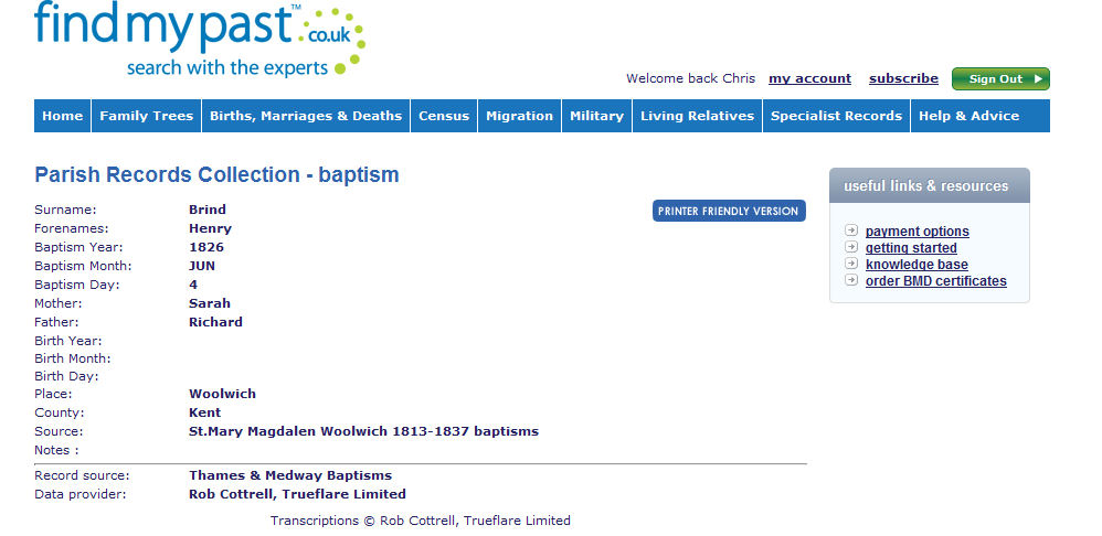 | Yaki's tree also says: See reference to the Brind family in the records of the Woolwich district by W T Vincent.