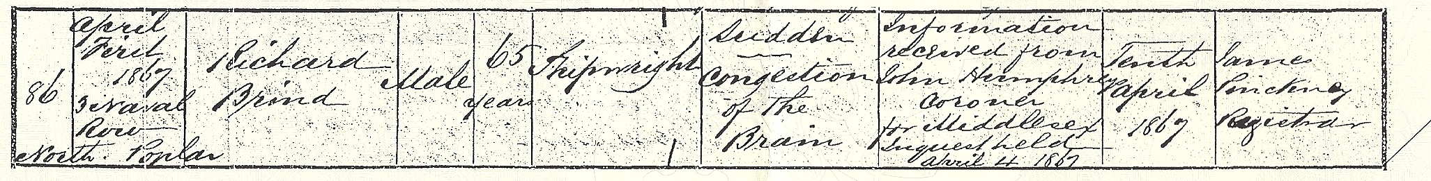 Male | 65 years | Shipwright | Sudden congestion of the Brain | Information received from John Humphreys Coroner for Middlesex inquest held April 4, 1867 |