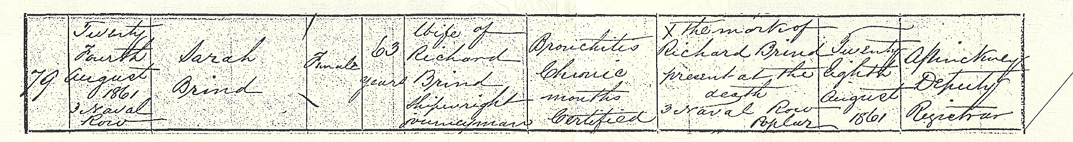 Female | 63 years | Wife of Richard Brind Shipwright journeyman | Bronchitis chronic months certified | x the mark of Richard Brind present at the death 3 Naval Row Poplar |