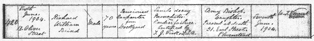 | 1904 | Richard W Brind | Age 70 | St Margarets | Residence 18 Olive Street |
