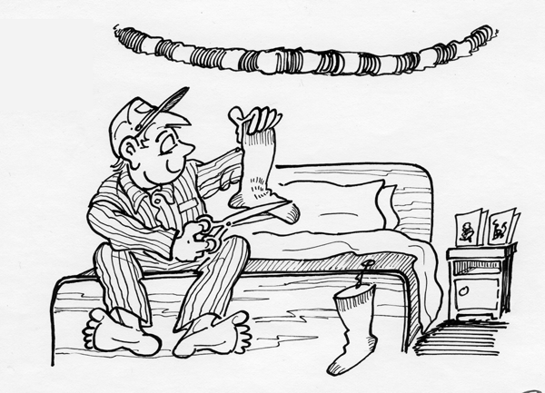 One Christmas Eve he cut a hole in a sock his mother hung on the end of his bed.