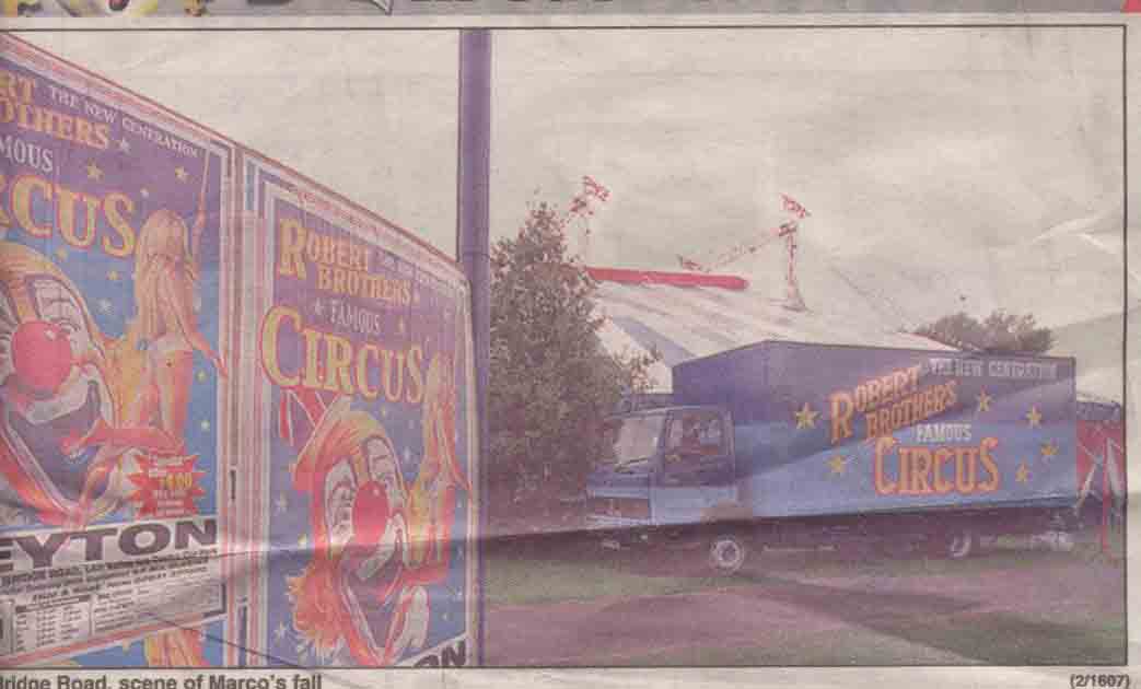 The Big Top in Lea Bridge Road, scene of Marco's fall. (2/1 607) TERROR ON TIGHTROPE Performer in hospital after 25ft fall By Graeme Culliford A DARING tightrope walker had a terrifying brush with death at the circus last week. Circus performer Marco shocked onlookers when he fell 25ft during the dangerous finale of his high-wire act. Wearing two blindfolds and with a Mexican basket on each foot, he attempted to walk the tightrope in front of startled spectators at the Robert Brothers Famous Circus in Lea Bridge Road, Leyton. The stunt was the final performance of a 90-minute show on Friday. Circus organisers said that Marco, 46, was supposed to pretend to fall, but hang on to the tightrope with his foot. He slipped and hit the ground, however, and was rushed to hospital. He is expected to make a full recovery. Jonathan Brind, 49, from Leyton, was an eyewitness. He said: "I thought he was absolutely superb. Marco was one of the best high wire acts I have ever seen. "But my partner Katy said she thought he was having a bad night as he kept stumbling. I noticed that he tended to stumble when he was close to one side or the other. "For his finale he put two black hoods over his head and put his feet into objects that looked like buckets. "He'd got about 5ft from the platform when he lost his balance. He tried to grab hold of the tightrope with his feet but with the buckets on he couldn't get any purchase. "He came straight down on to the ground. "There were a few screams and then a hushed silence. "A few seconds later the circus staff were asking the audience to call an ambulance." A circus spokeswoman said that Marco was out of hospital and was expected to make a full recovery. She said: "He's fine, he just put his foot in the wrong place. Circus performers know that they are always taking risks - that's the nature of their business. This kind of thing does happen now and again. "Marco's been doing this act since he was seven. He chose to be a performer at a very young age and he knows the risks. "It's like an electrician could get killed putting his hand in an electric box. "I've no idea whether he intends to carry on performing. I would think that the answer is definitely yes." Robert Brothers Famous Circus is next due to perform in Edmonton. Leyton & Leytonstone Guardian Thursday, October 3, 2002 |