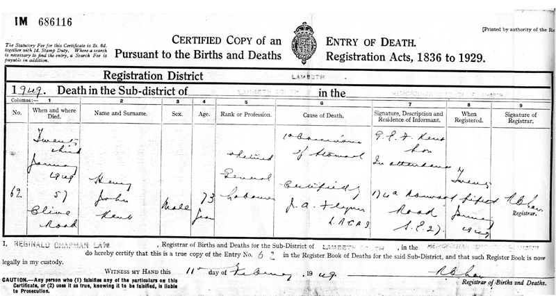 | REGINALD CHAPMAN LAW  Registrar of Births and Deaths for the Sub-District of LAMBETH SOUTH in the  METROPOLITAN BOROUGH 0F LAMBETH  do hereby certify that this is a true copy of the Entry No. 62 in the Register Book of Deaths for the said Sub-District and that such Register Book is now legally in my custody WITNESS MY HAND this 11th day of February 1949  |