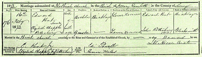 | 176 | 16th Feby, 1873 | Edward Kent Junr. | Both of | Bachelor | Bricklayer | Lower Norwood | Edward Kent | Bricklayer |